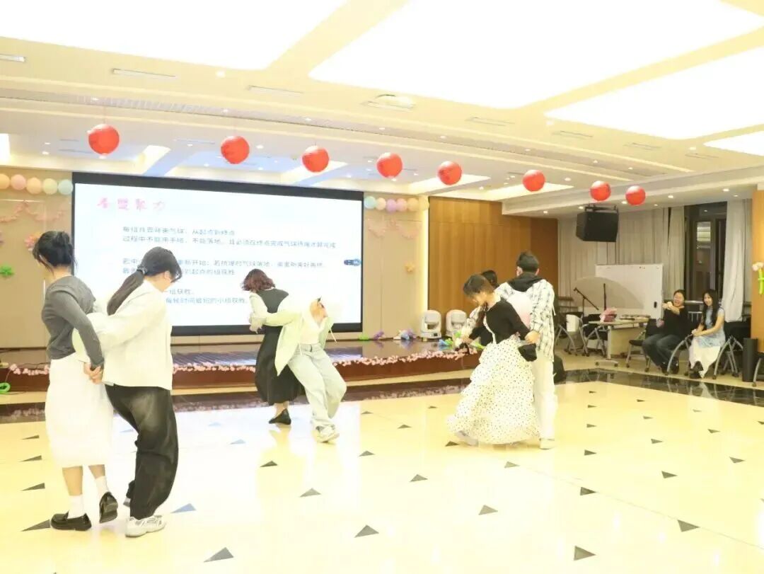 麟舞社的活力开场瞬间点燃全场,随后“爱的抱抱”与“双人背靠背挤气球”等暖场游戏接连进行。欢声笑语中,不同学院同学间的陌生感悄然消融,友谊与默契在互动中悄然萌芽。