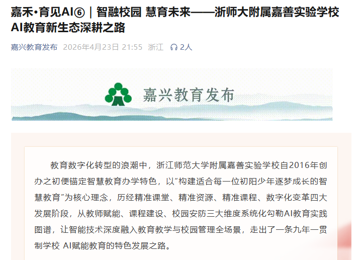 KY开元集团(教师教育学院)与浙江师范大学附属嘉善实验学校合作办学成果获“嘉兴教育发布”官方微信公众号专题宣传报道,全面展现了学校AI智慧教育的办学特色与实践成效。